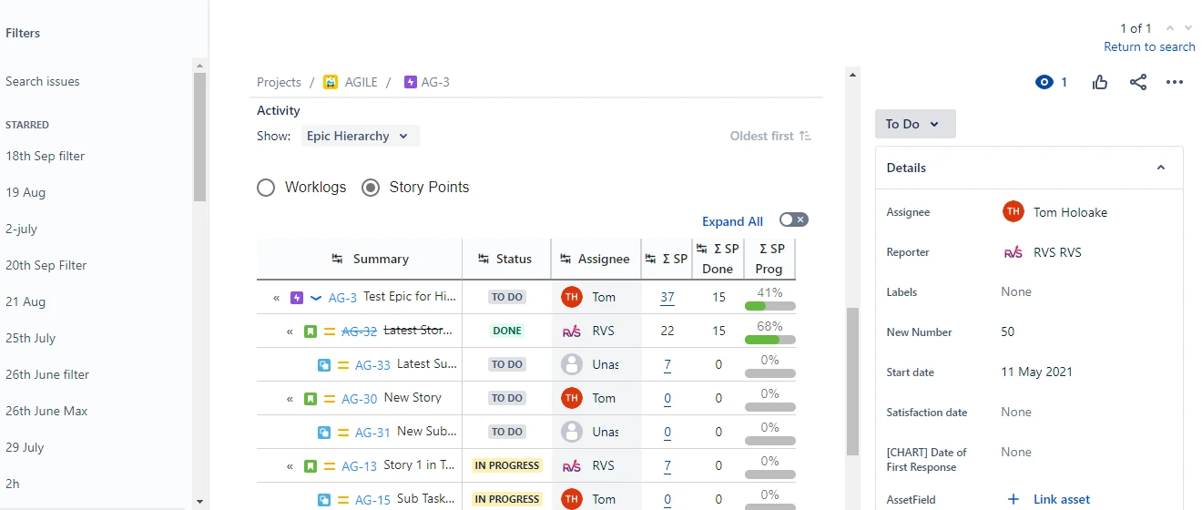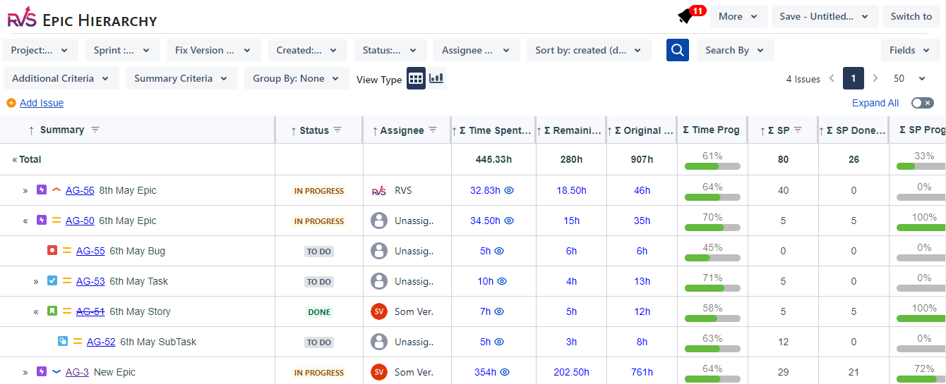Create / View the full Issue Type hierarchy of Linked issues, Portfolio/Advanced Roadmaps, Epics, and Subtasks up to 10 levels. Sum up Time Spent, Org Estimate, Time Rmng, % Complete Quick Summary bars
