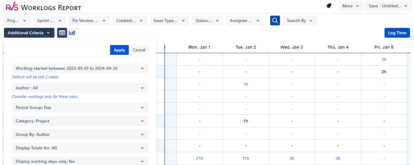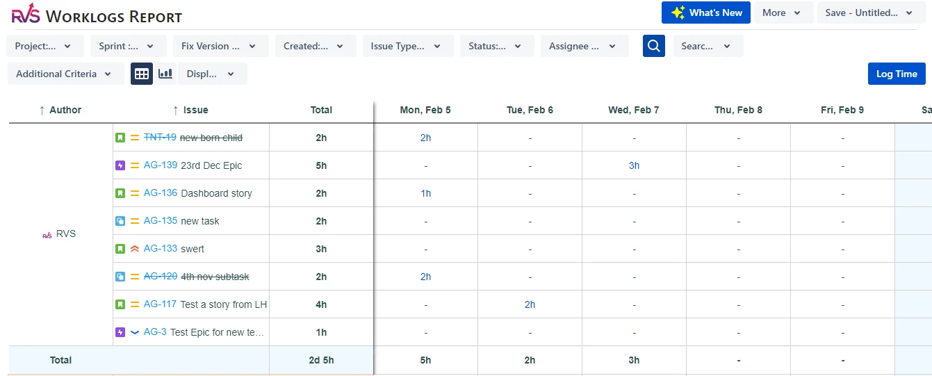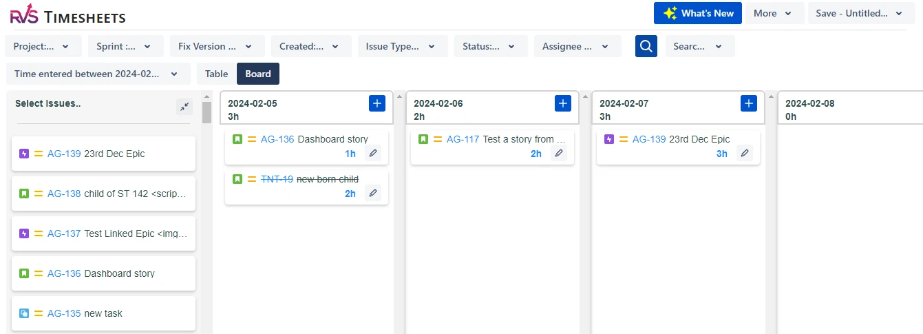 No need to visit each Issue Screen to log time. Enter time spent for multiple days and multiple issues from a single screen. Switch easily between a Kanban style board view or a simple table view to enter time spent.